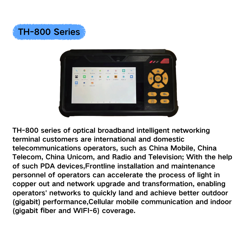 This is the TH-800 series optical broadband intelligent networking terminal, designed for domestic and international telecom operators. When paired with dedicated PDA devices, it helps operators accelerate fiber deployment and network upgrades, delivering enhanced communication and network coverage (supporting Gigabit fiber and WiFi-6).