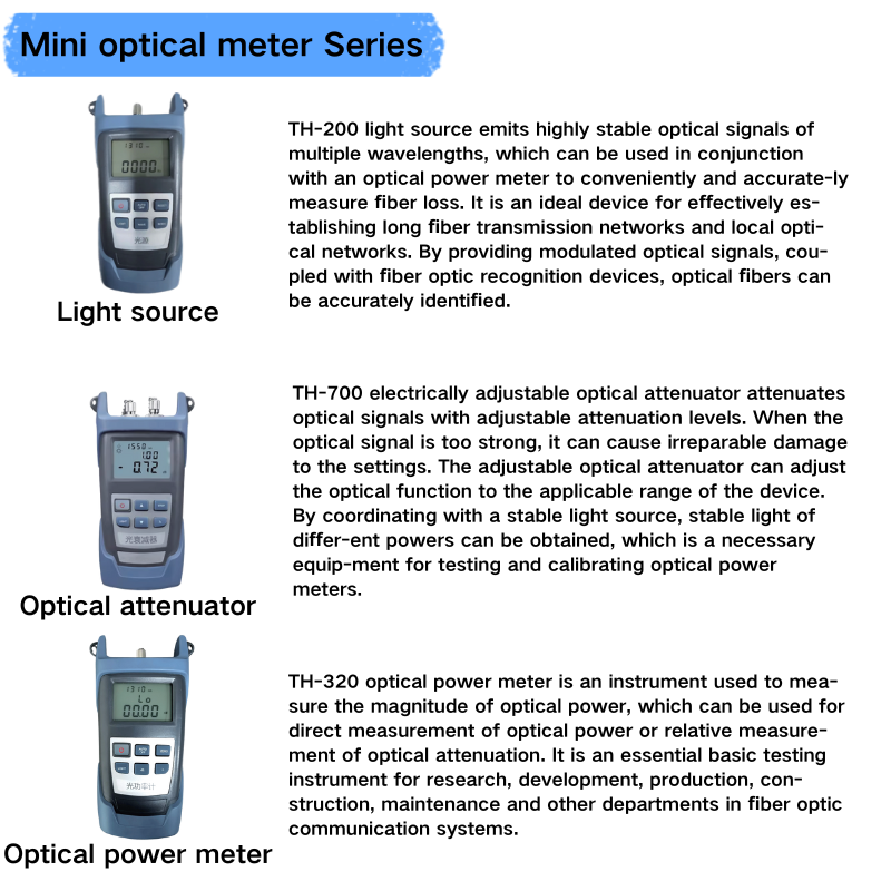 This is the Mini Optical Instrument Series, comprising optical communication testing tools such as light sources, optical attenuators, optical power meters (including models with red/green light functions), and red/green light pens. It serves as a commonly used portable device for fiber optic network maintenance and testing.